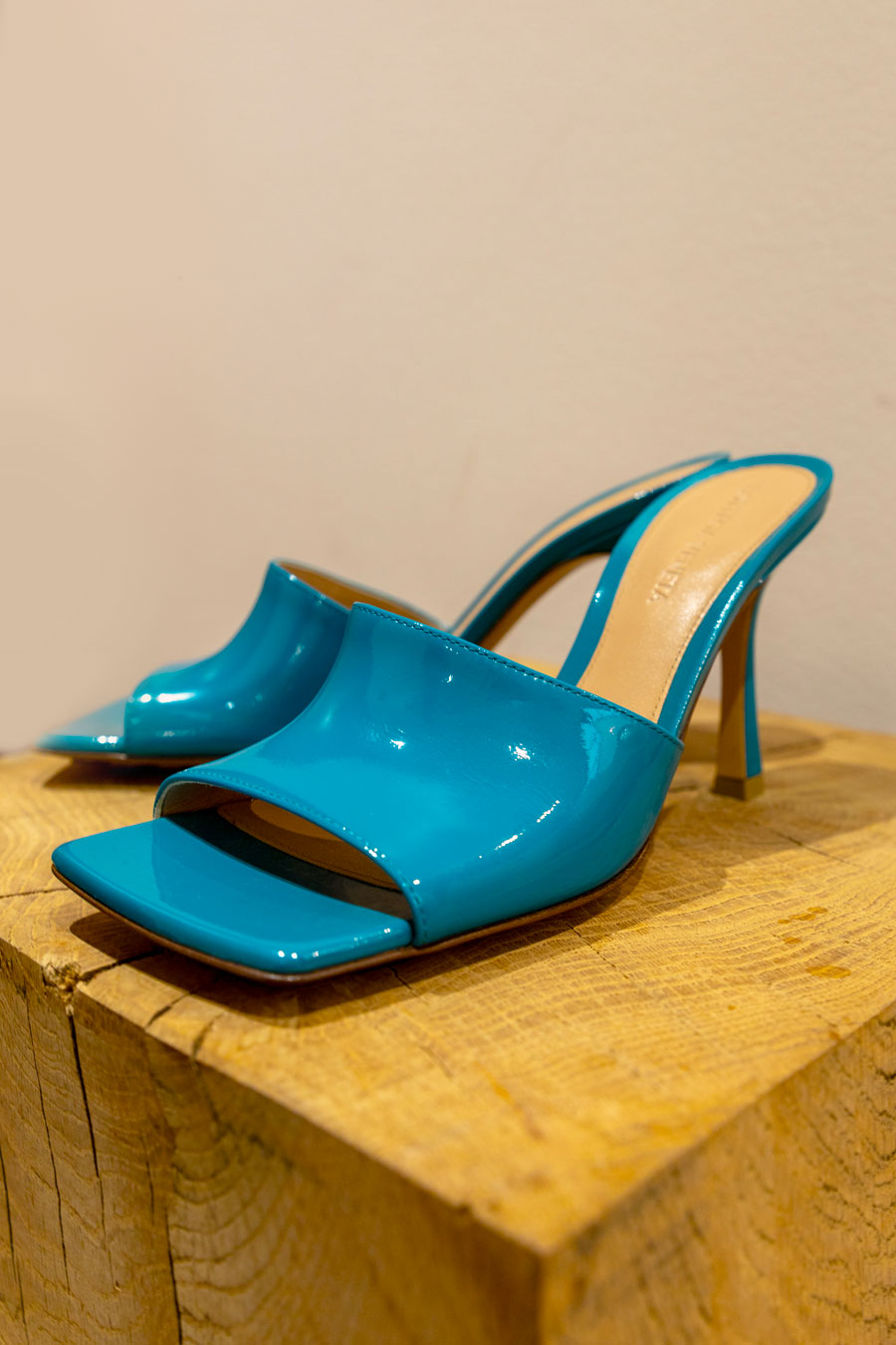 Effet vernis uni, doublure en cuir, pointe carrée, talon bobine, semelle grainée