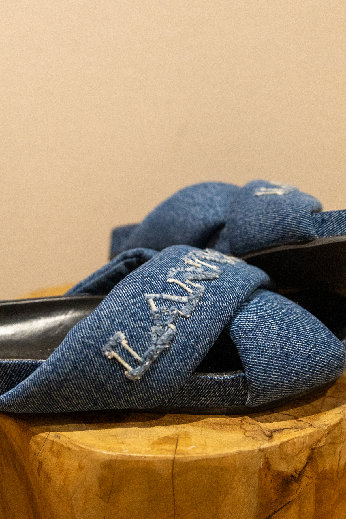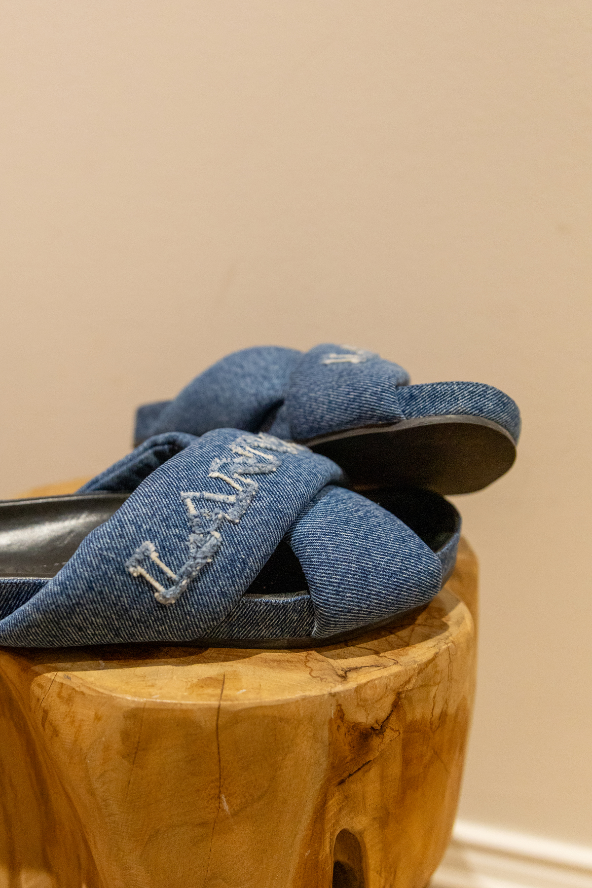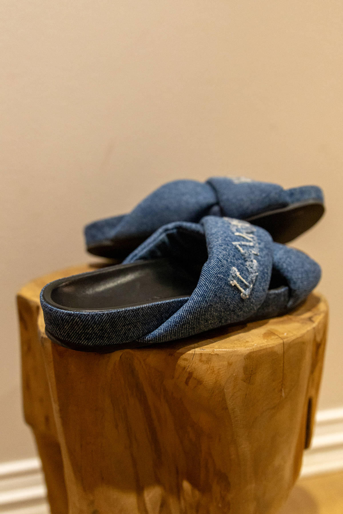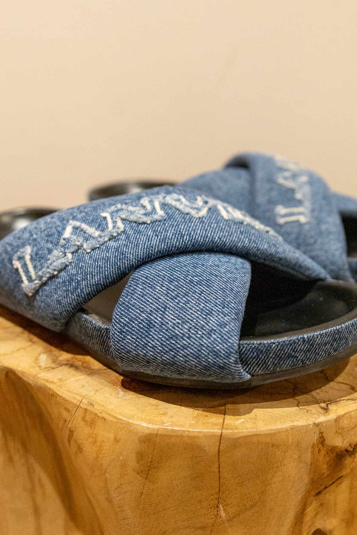Couleur bleu indigo denim. Logo brodé sur le devant. Détail de brides croisées Bout ouvert. Semelle plate en caoutchouc