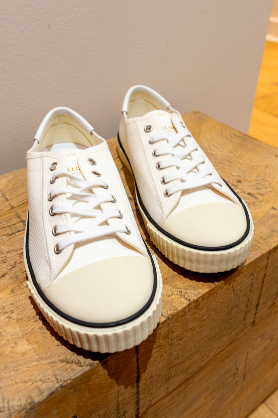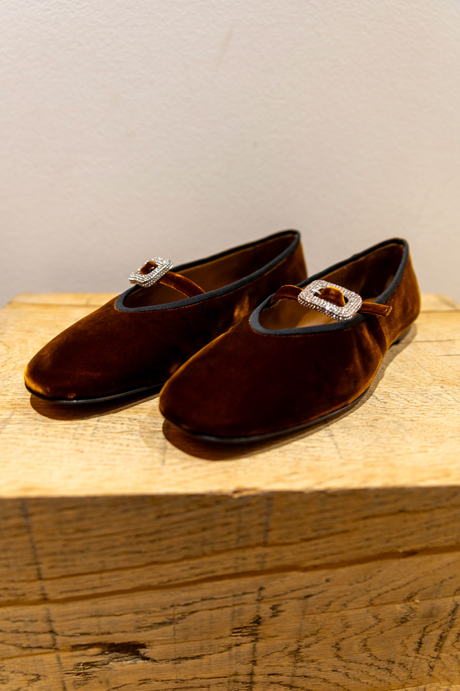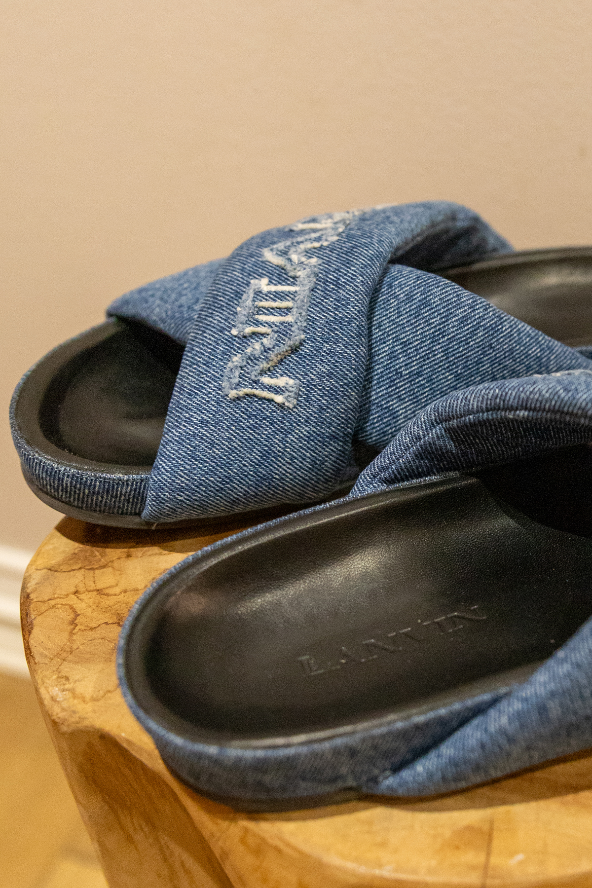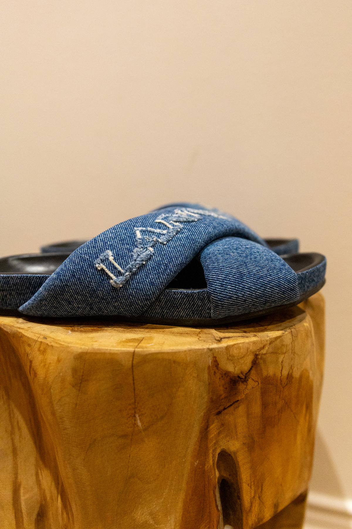 Couleur bleu indigo denim. Logo brodé sur le devant. Détail de brides croisées Bout ouvert. Semelle plate en caoutchouc