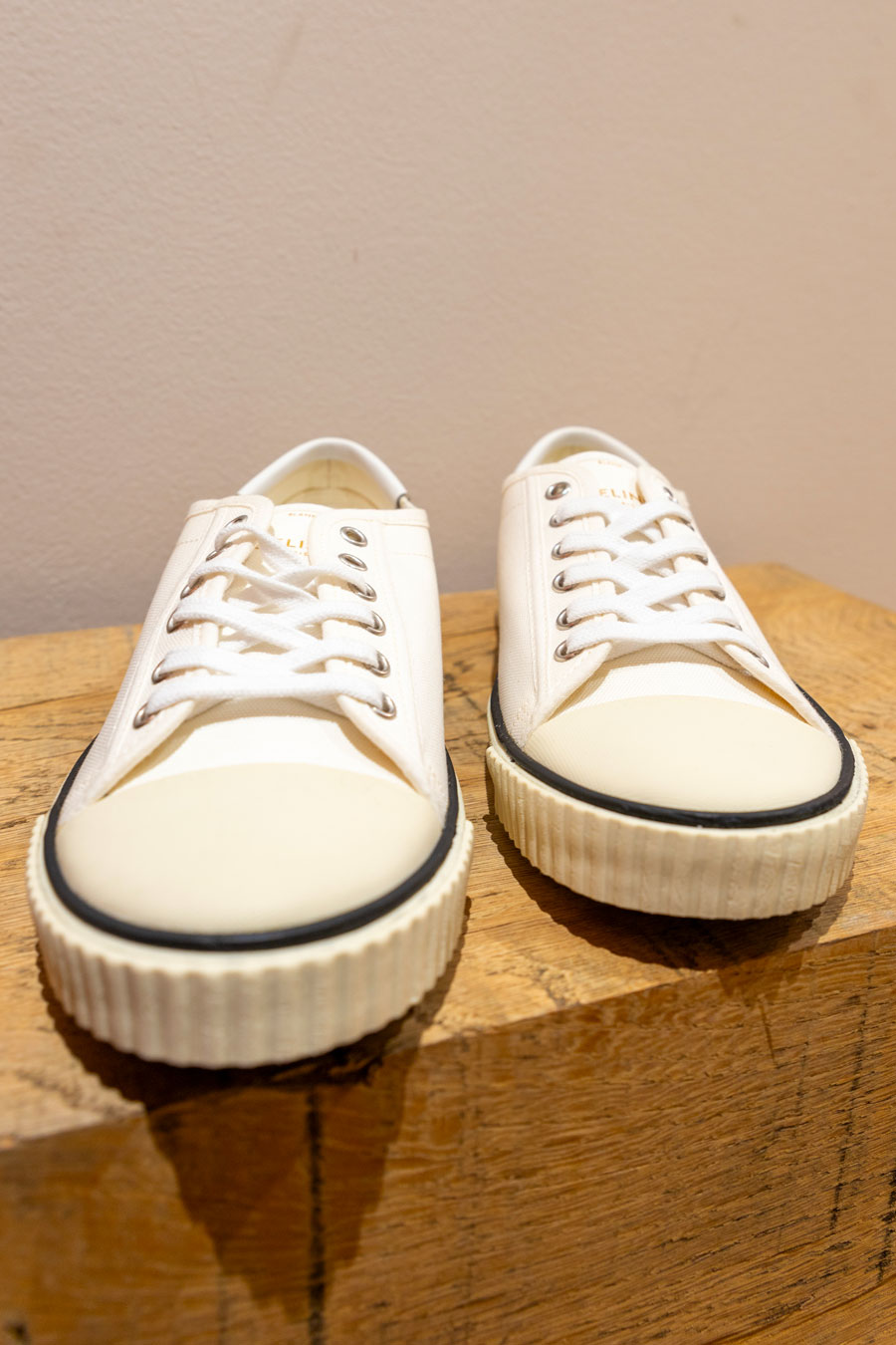Basket Céline en toile, fabriqué en Espagne. Couleur blanc, lacets blanc.